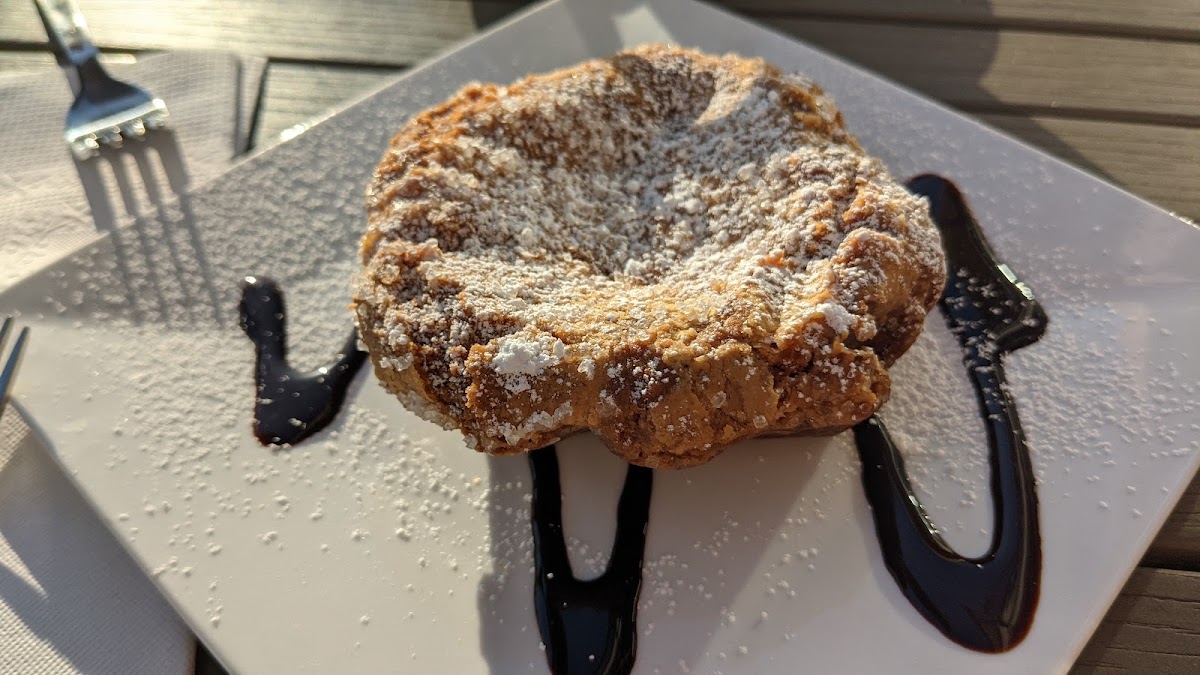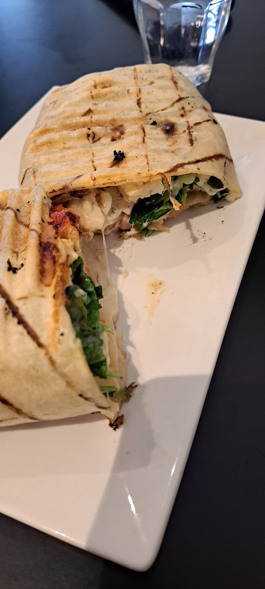 Tom Tsambourlianos notes their delightful chicken wrap, boldly pressed on a hot grill, packed with vibrant arugula, peppers, and melting cheese—a true comfort food that’s perfect for a quick bite in between your daily adventures.
